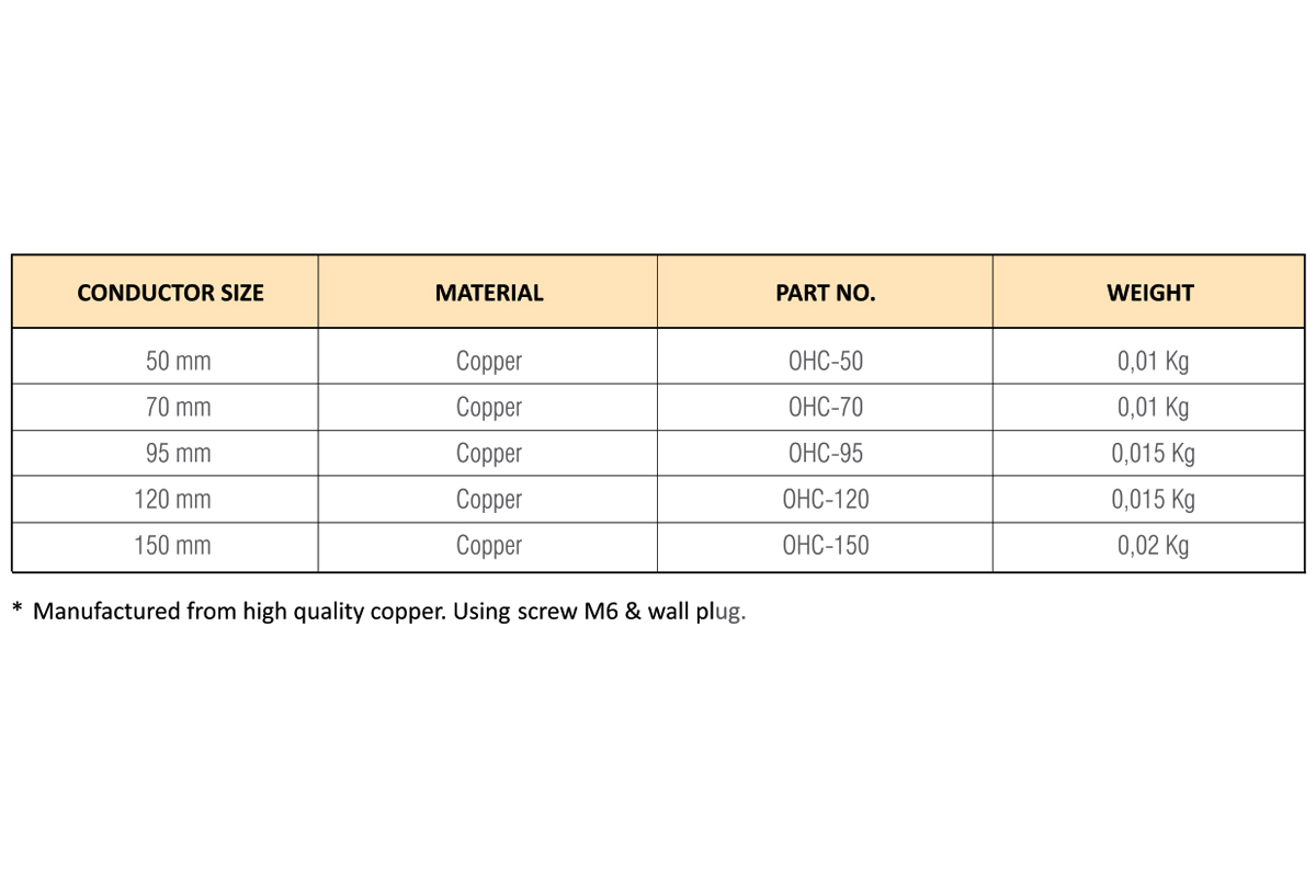 50 mm, 70 mm, 95 mm, 120 mm, 150 mm